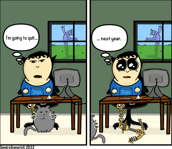 Greener Grass Posted bySandraScenarioSMarch 21, 2022June 12, 2023Posted inComics, Satire, Weekly ComicTags:#procrastination, anchor, Comic, comic art, comic artist, comic drawing, digital art, digital artist, feeling stuck, golden handcuffs, humor, I Quit, job, jojamart, life, purpose, quitting, Satire, tubeman, webcomic, webtoon, Weekly Comic March 21st, 2022 Share this: Click to share on Reddit (Opens in new window) Reddit Tweet Click to share on WhatsApp (Opens in new window) WhatsApp Click to email a link to a friend (Opens in new window) Email Like Loading... Published by SandraScenarioS Attempting to do a project for myself to not only make people smile but to improve my skills and learn new ones. View more posts