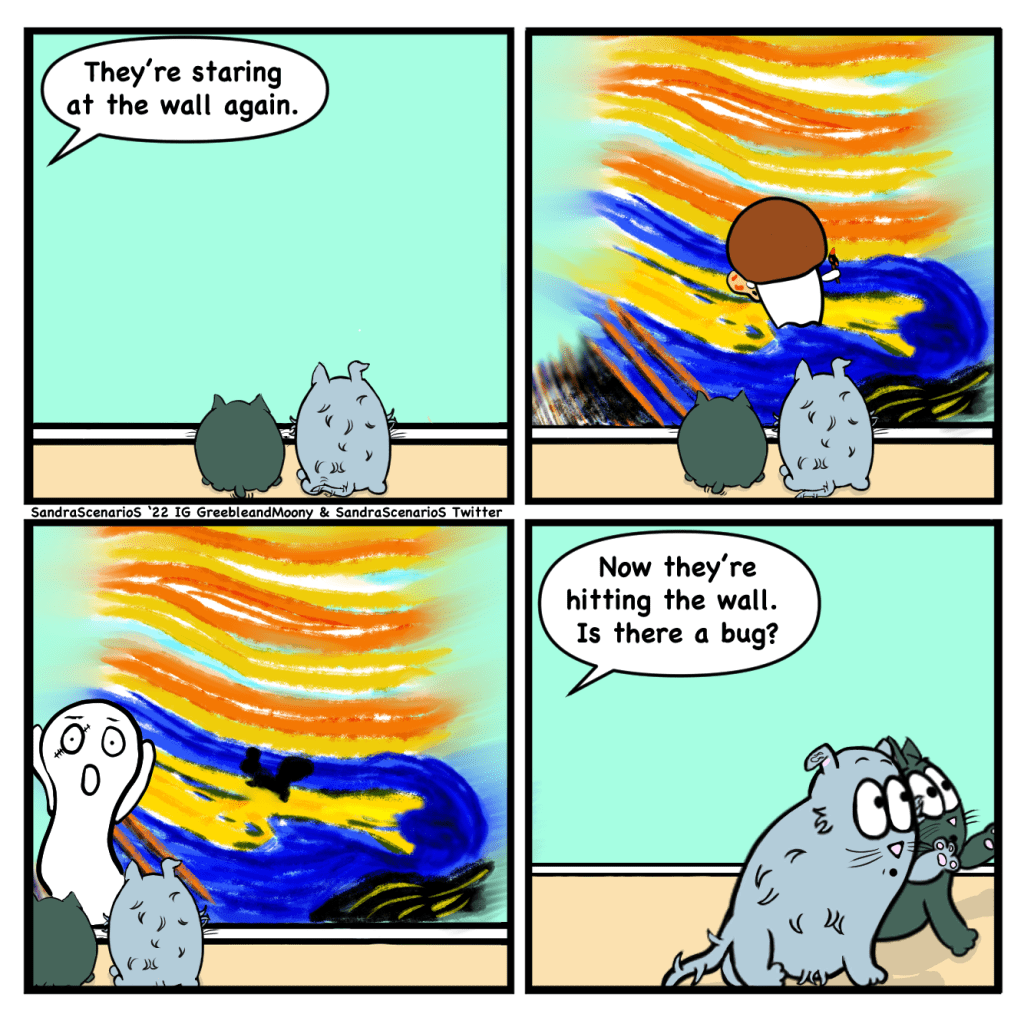 G&M #54: Greeble’s Art Posted bySandraScenarioSJune 23, 2022June 22, 2022Posted inDaily Comic, Greeble & MoonyTags:art, art appreciation, artist, cats, Comic, comic a day, comic artist, comic drawing, comic panel, comic strip, Daily Comic, digital art, digital artist, drawing, funny, greeble, humor, moony, the scream, webcomic, webtoon, wordpress comic June 23rd, 2022 Greeble & Moony #54Credit: Katherine shared a story about her cat staring at the wall. Share this: Click to share on Reddit (Opens in new window) Reddit Tweet Click to share on WhatsApp (Opens in new window) WhatsApp Click to email a link to a friend (Opens in new window) Email Like Loading... Published by SandraScenarioS Attempting to do a project for myself to not only make people smile but to improve my skills and learn new ones. View more posts