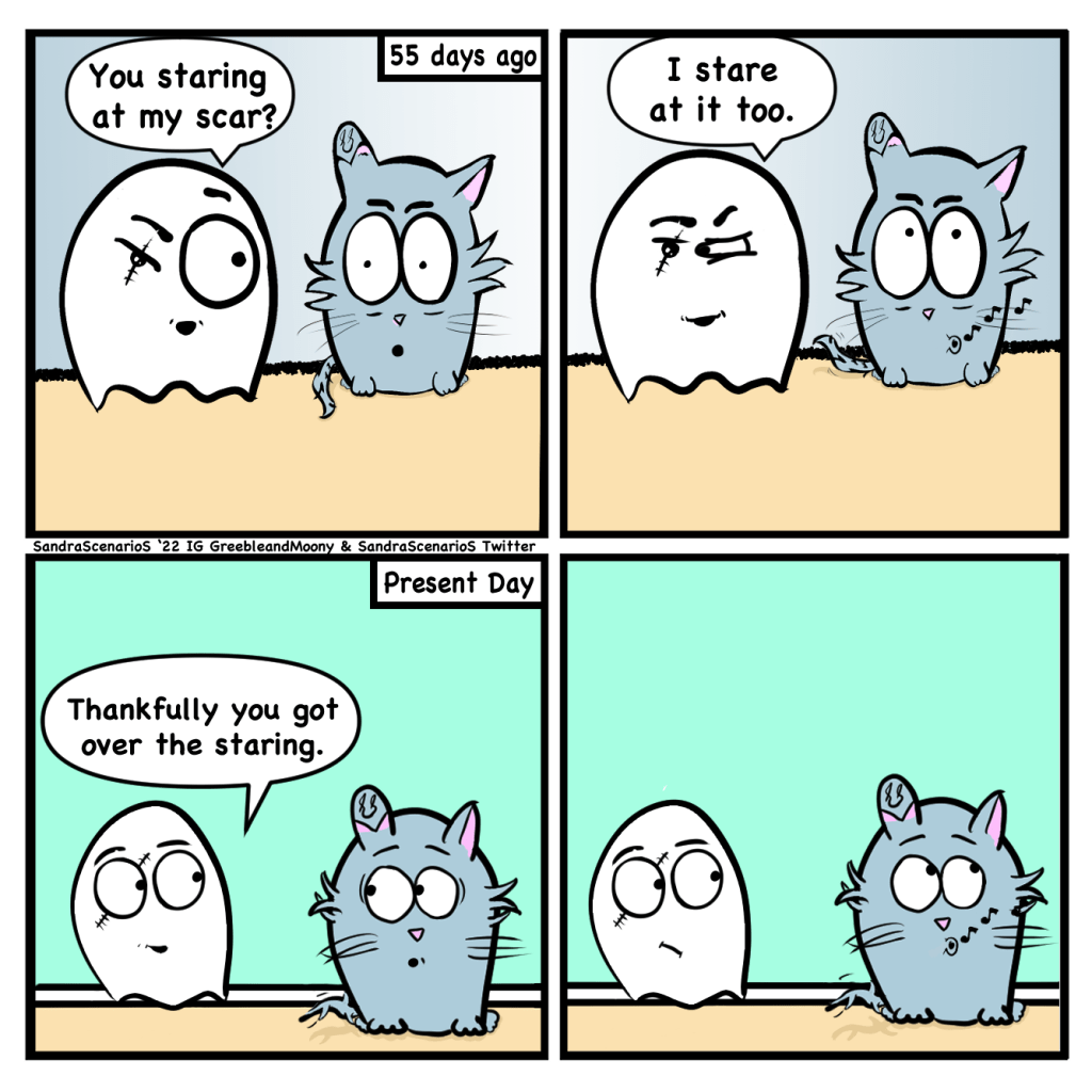 G&M #55: Scar Stare Posted bySandraScenarioSJune 24, 2022June 23, 2022Posted inDaily Comic, Greeble & MoonyTags:art, beginner artist, cats, Comic, comic a day, comic art, comic artist, comic drawing, comic panel, comic strip, Daily Comic, digital art, digital artist, drawing, female artist, funny, greeble, humor, moony, new artist, scar, staring, webcomic, webtoon, wordpress comics June 24th, 2022 Greeble & Moony #55 Share this: Click to share on Reddit (Opens in new window) Reddit Tweet Click to share on WhatsApp (Opens in new window) WhatsApp Click to email a link to a friend (Opens in new window) Email Like Loading... Published by SandraScenarioS Attempting to do a project for myself to not only make people smile but to improve my skills and learn new ones. View more posts