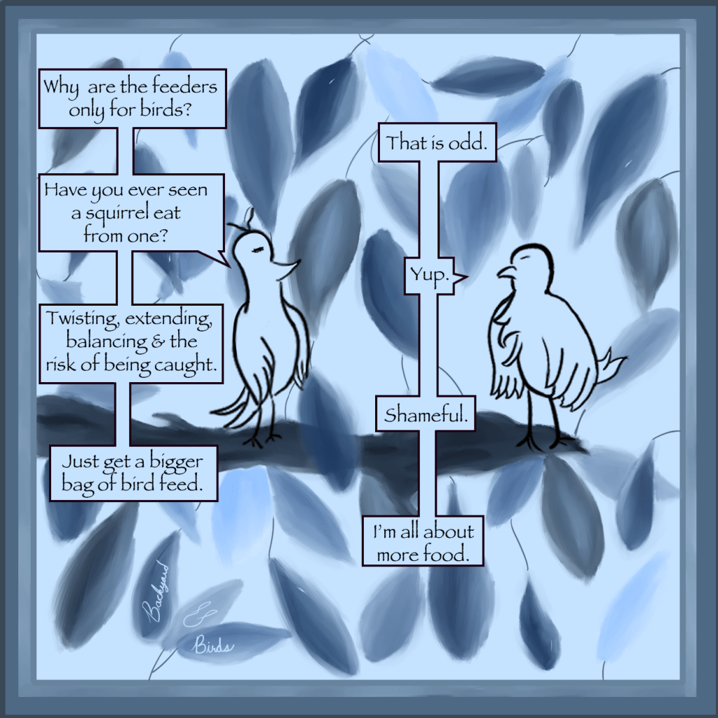 Backyard Birds #8 Posted bySandraScenarioSAugust 21, 2022Posted inBackyard Birds, out of the blueTags:backyard, Backyard Birds, bird feed, birds, blue, Comic, comic artist, comic drawing, comic strip, conversational humor, digital art, digital artist, dry humor, funny, humor, out of the blue, squirrels, webcomic, webtoon August 21st, 2022 “Out of the Blue” Series Share this: Click to share on Reddit (Opens in new window) Reddit Tweet Click to share on WhatsApp (Opens in new window) WhatsApp Click to email a link to a friend (Opens in new window) Email Like Loading... Published by SandraScenarioS Attempting to do a project for myself to not only make people smile but to improve my skills and learn new ones. View more posts