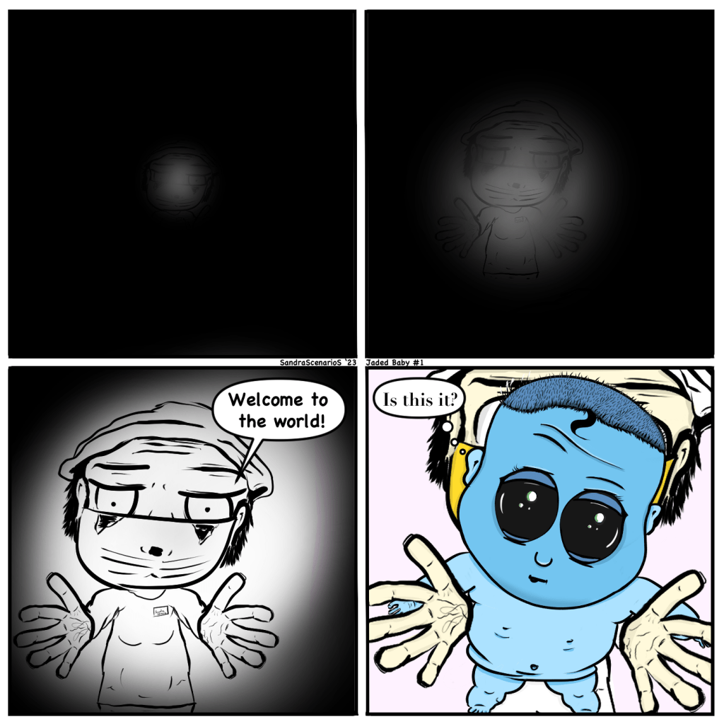 Jaded Baby #1 Posted bySandraScenarioSMay 8, 2023May 8, 2023Posted inWeekly ComicTags:baby, baby blues, baby comic, baby drawing, Comic, comic art, comic artist, comic drawing, comic panel, comic series, comic strip, dark humor, digital art, digital artist, funny, humor, jaded, jaded baby, webcomic, webtoon, Weekly Comic May 8th, 2023 Thanks to Bonnye and Stephanie for the inspiration! Share this: Click to share on Reddit (Opens in new window) Reddit Tweet Click to share on WhatsApp (Opens in new window) WhatsApp Click to email a link to a friend (Opens in new window) Email Like Loading... Published by SandraScenarioS Attempting to do a project for myself to not only make people smile but to improve my skills and learn new ones. View more posts
