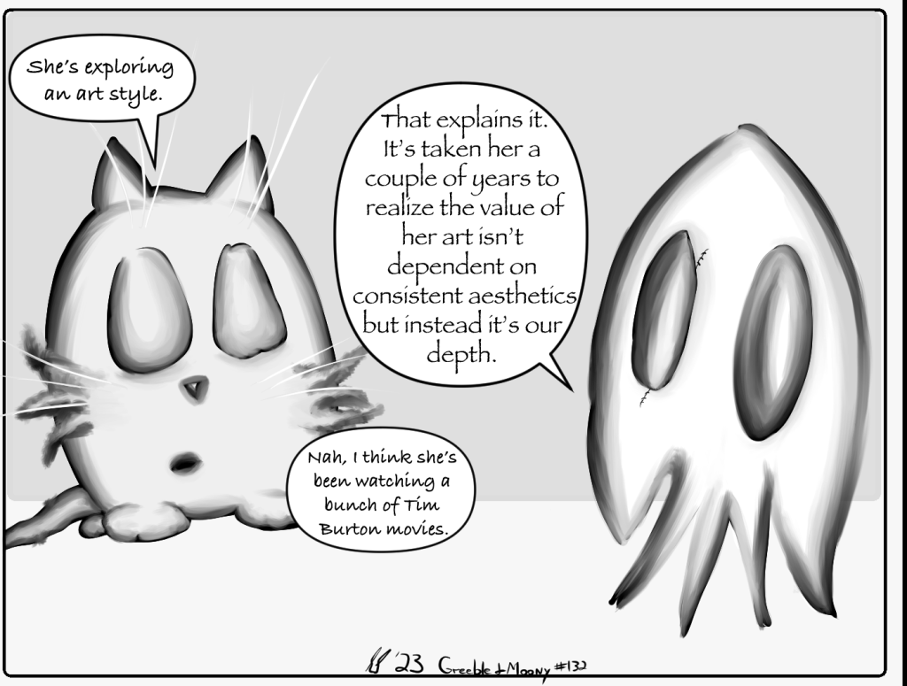 G&M #132: Art Style Posted bySandraScenarioSOctober 23, 2023November 2, 2023Posted inGreeble & MoonyTags:black and white, black and white drawing, Comic, comic art, comic artist, comic drawing, comic panel, comic series, comic strip, digital art, digital artist, funny, greeble, greeble and moony, humor, moony, Tim burton, webcomic, webtoon October 23rd, 2023 Greeble & Moony 132 Share this: Click to share on Reddit (Opens in new window) Reddit Tweet Click to share on WhatsApp (Opens in new window) WhatsApp Click to email a link to a friend (Opens in new window) Email Like Loading... Published by SandraScenarioS Attempting to do a project for myself to not only make people smile but to improve my skills and learn new ones. View more posts
