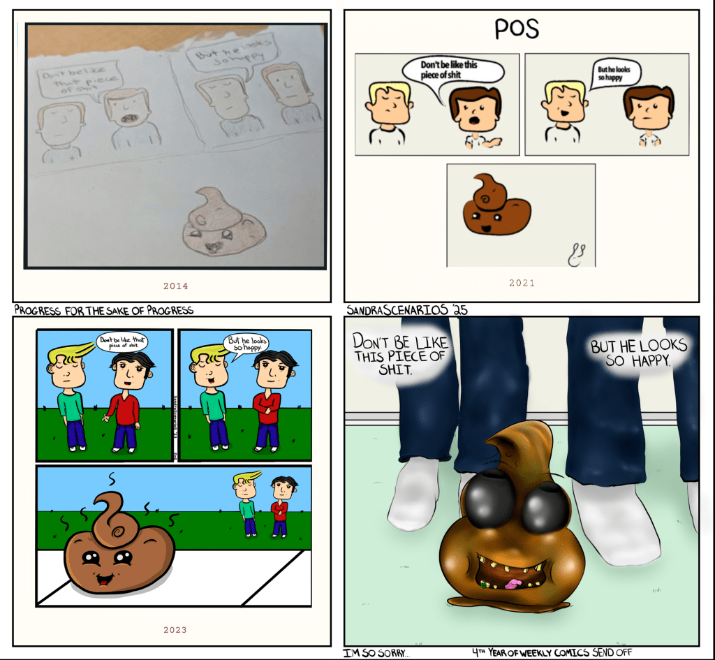End of 4 years of weekly comics and about to start a new year I thought progression of the first comic I put on the internet may be a good way to send off the 4th year. Realized that drawing poop in more detail isn’t in me so this will be the last progression of this comic… enjoy?