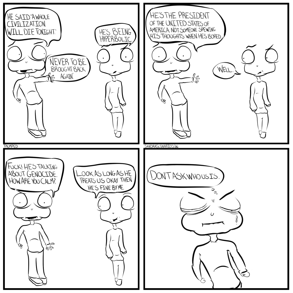 Trumped Posted bySandraScenarioSApril 13, 2026April 8, 2026Posted inWeekly ComicTags:Comic, political April 13th, 2026 Share this: Share on Reddit (Opens in new window) Reddit Tweet Share on WhatsApp (Opens in new window) WhatsApp Email a link to a friend (Opens in new window) Email Like Loading... Published by SandraScenarioS Attempting to do a project for myself to not only make people smile but to improve my skills and learn new ones. View more posts